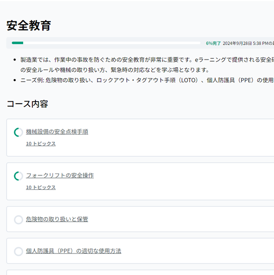 - 製造業では、作業中の事故を防ぐための安全教育が非常に重要です。eラーニングで提供される安全研修は、作業現場での安全ルールや機械の取り扱い方、緊急時の対応などを学ぶ場となります。
